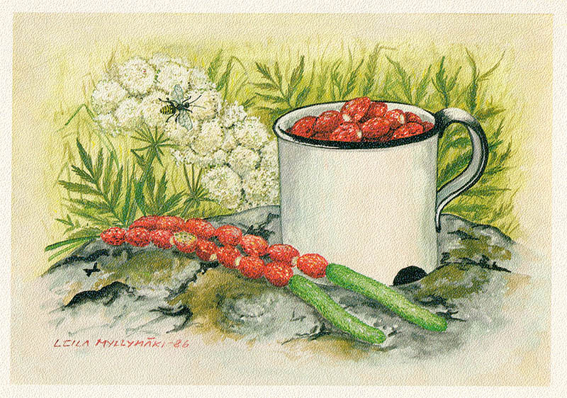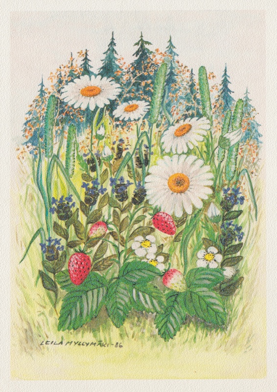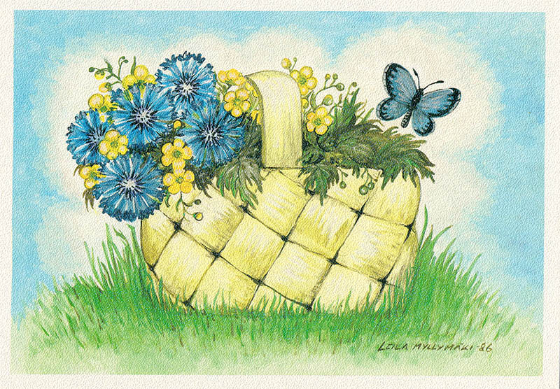 Luonto on inspiroinut minua aina. Pikkutyttönä katselin lumoutuneena punatulkkuja huurteisissa pihlajanoksissa ja pakkasen taiteilemia jääkukkia ikkunassa. Ja kesäinen niitty väreineen, ei sen kauniinpaa. Ateneumiin pyrkiminen jäi kuitenkin vain haaveeksi kuvaamataidonopettajan ja ammatinvalinnanohjaajan kehoituksista huolimatta. Voinpa melkein sanoa, että olen itseoppinut postikorttipiirtäjänä. Erilaisista mainonnan opiskeluista on kyllä ollut hyötyä.